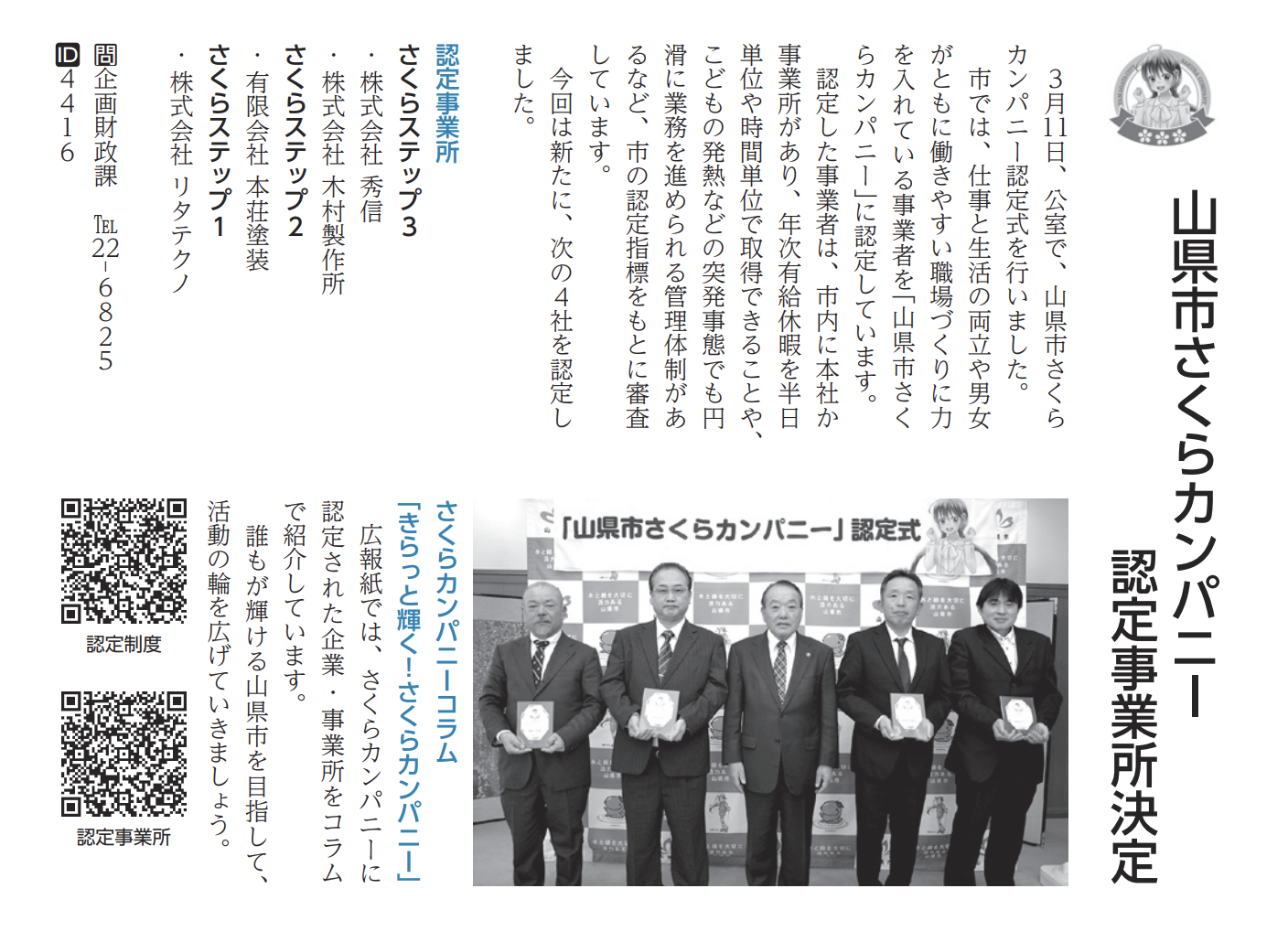 この度、弊社は山県市が認定する「さくらカンパニー」のステップ3に認定され、3月11日に弊社代表の井上が市役所で行われた認定式に出席しました。